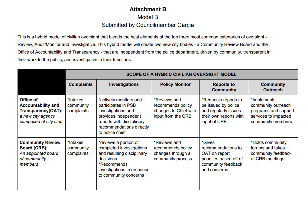 Under Garcia’s model, a new city agency, the Office of Accountability and Transparency, which would be composed of city staff, would actively monitor and participate in PSB investigations and would provide independent reports with recommendations on discipline to the chief. Garcia’s model also would establish a Community Review Board which would review completed PSB investigations and the resulting disciplinary action, and could recommend investigations to be carried out in response to concerns from members of the community.