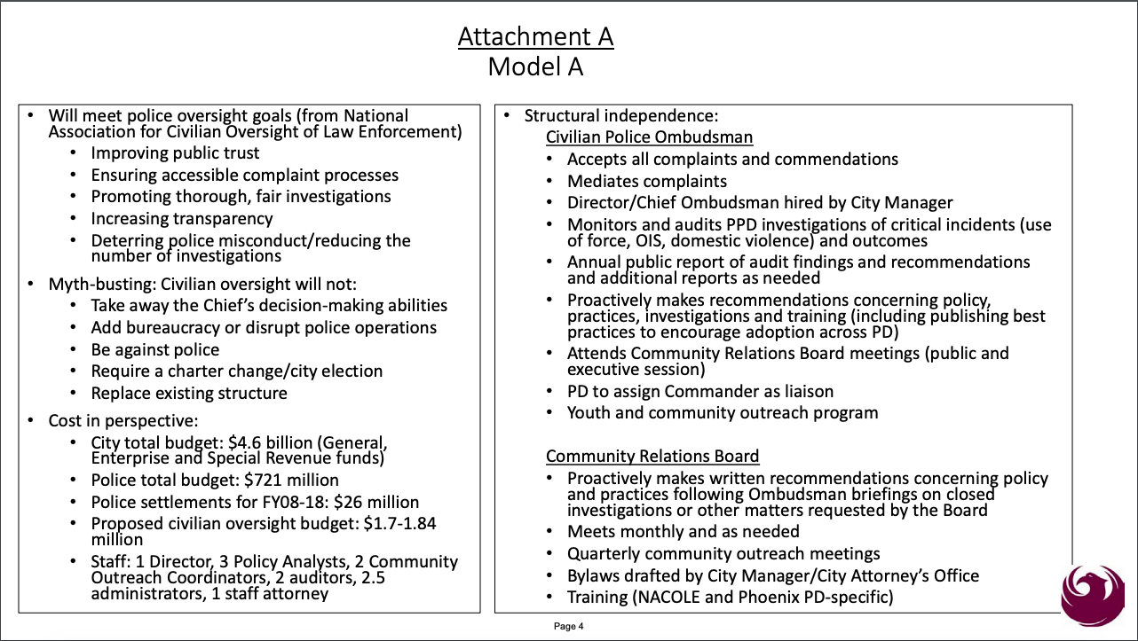 Adopting a model used by several other cities, including Denver, Gallego chose to put forth a civilian oversight model that allows the oversight body to mediate complaints it receives, should residents chose to go the route of mediation.