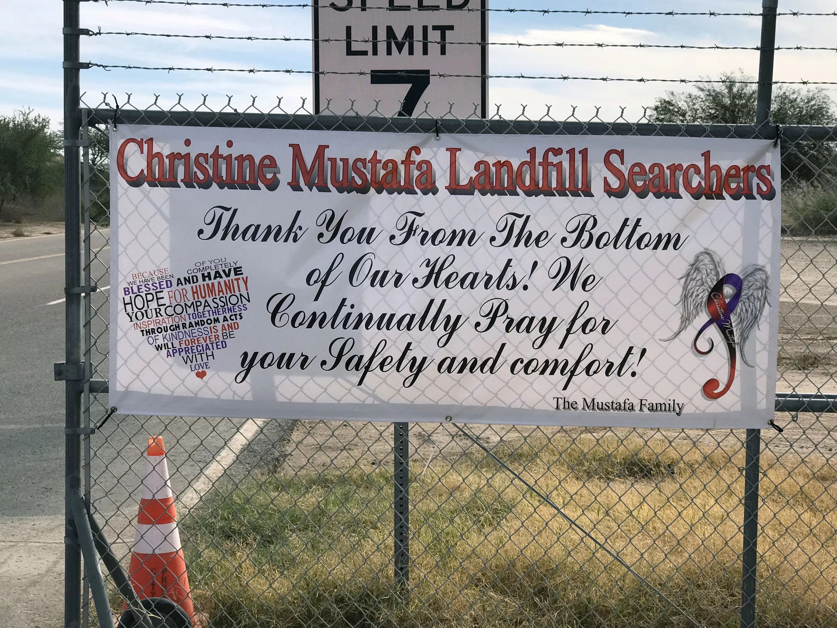 Williams told reporters Friday that no effort was too much to bring peace and justice to Mustafa’s family. Behind her, a banner from that family thanking the searchers fluttered in the steady desert breeze on the chain-link entry gate to the landfill.