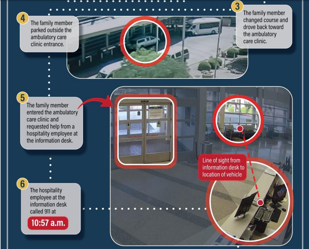“That is right in front of our Ambulatory Care Clinic,” one of the three hospital leaders told investigators, though the report doesn’t specify which. “I think that’s within our rapid response team to react.”