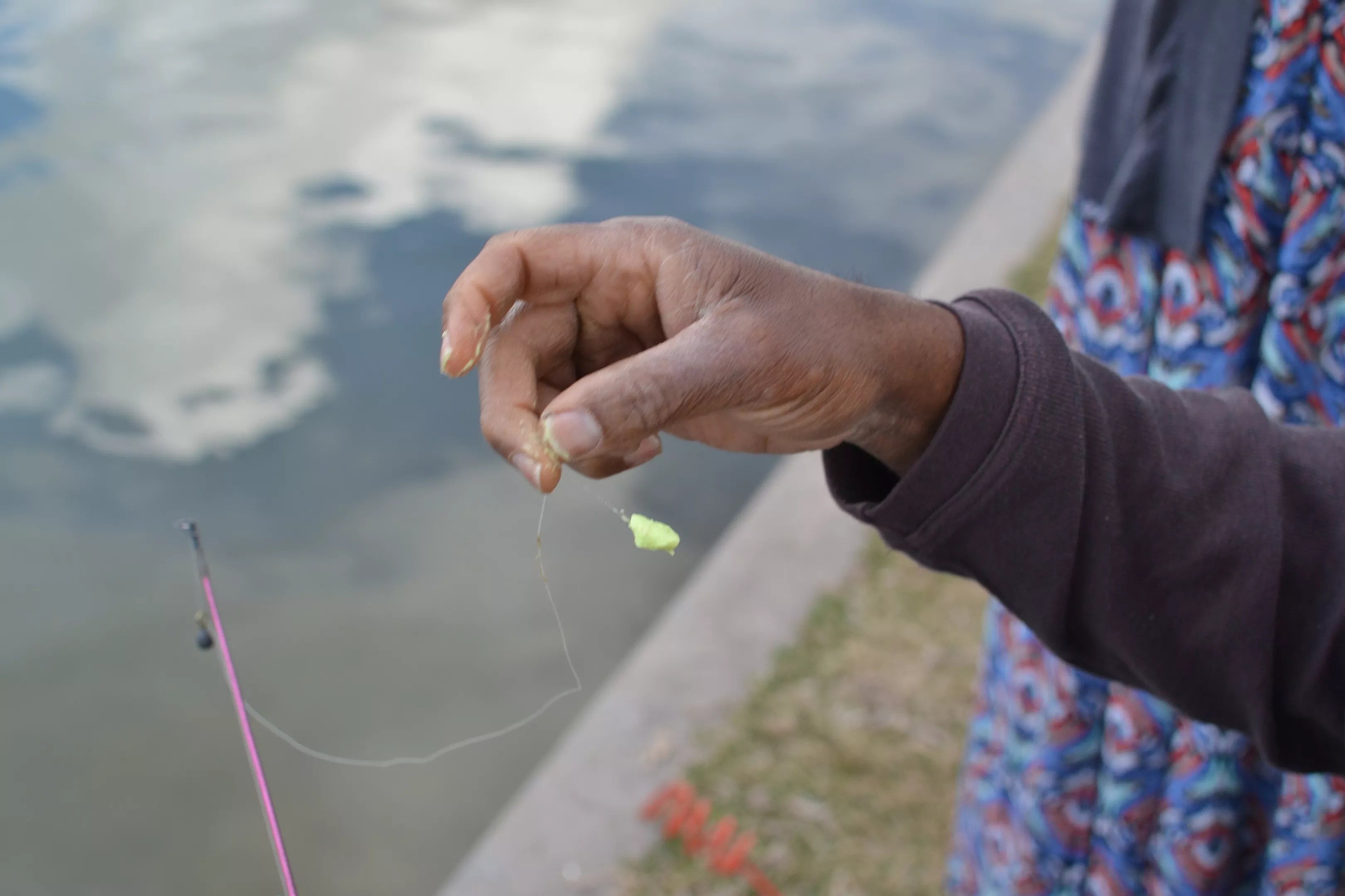Steven took a smudge of green putty, i.e. trout bait, and dabbed it on his hook. He wiped his fingers on the grass.