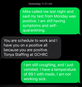 Reminded in a follow-up email that the worker’s text messages indicated that the facility did ask a staff member with symptoms to come into work, Rasmussen replied: “Thanks for pointing out the discrepancy, and what I should have said is that we would not require [italics in original] a staff member to work in those circumstances. As indicated, it is acceptable for COVID-19 positive staff to work with COVID-19 positive residents – in such circumstances, we may ask employees who have tested positive to work on the COVID-19 unit and assist in providing care to the residents.”