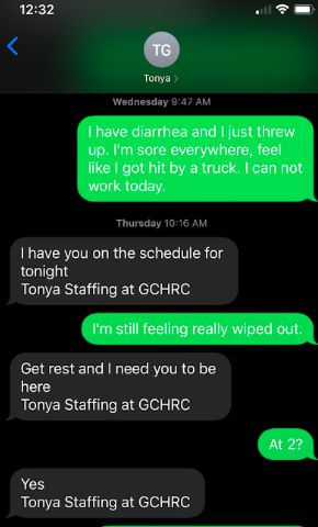 That night, she received another text message from the staffing scheduler.