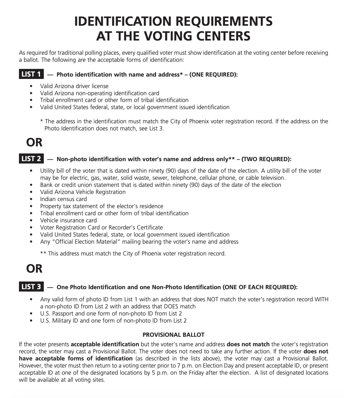Yes, you can vote at any of these places. Be in line by 7 p.m, or BE SILENCED. You don’t need to show up at any particular polling place. Just go to one of Phoenix’s 28 voting centers and cast a ballot. Want to speed up the process? Have your government-issued photo ID with your name and address on hand. Don’t have photo ID? Bring two forms of valid identification with your name and address. Read the following if you’re not sure if your identification will work: