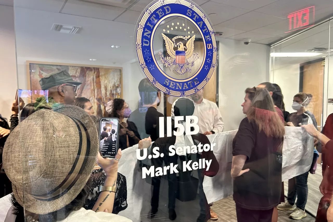 For about three hours, dozens of people filled the lobby of Kelly’s office on East Camelback Road, confronting Luis Heredia, Kelly’s state director, about the humanitarian crisis in Gaza and demanding that Kelly call for a ceasefire. The protesters sang songs and chanted rhymes, including “not another nickel, not another dime, no more money for Israel’s crimes.”