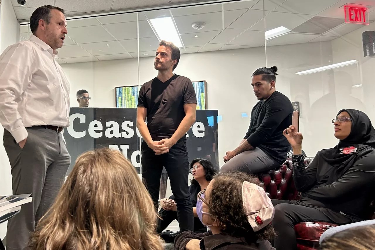 Luis Heredia (left), a staffer for Sen. Mark Kelly, told Kai Newkirk (center) and other protesters that police would soon arrive and arrest them during an event on Tuesday.