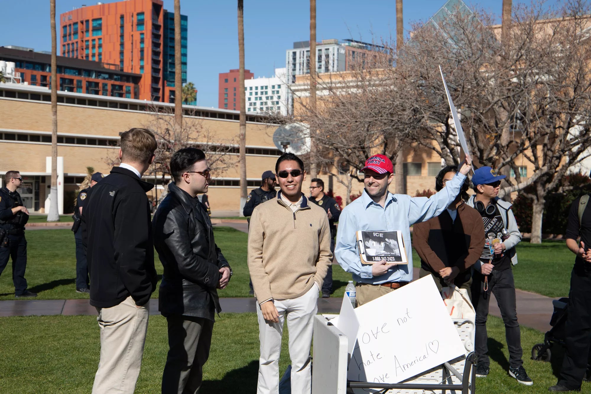 On Wednesday, the Arizona State University chapter of the far-right group College Republicans United announced it would set up a table at the school to urge fellow students to call Immigration and Customs Enforcement on their classmates. Friday, four CRU members stood near a table outside Hayden Library, only to be met by hundreds of pro-immigrant and anti-MAGA protesters.
