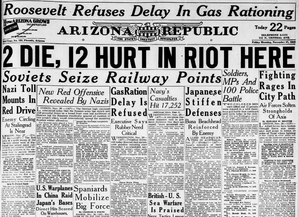 The riot dominated the front page of the Arizona Republic on November 27, 1942.