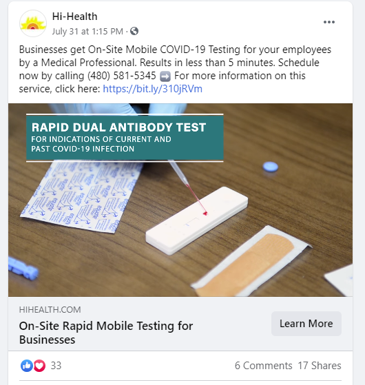 Yet Hi-Health advertises that its testing service can “bring employees back to work safely,” “identify employees with possible cases of Covid-19,” and “help prevent community spread.” Its Facebook page showcases some of the businesses that have used the service, including a chain of Mexican restaurants, another coffee shop, and a Phoenix law firm. The vitamin store offers discounts for weekly or bi-weekly tests and for large groups. Individual tests range from $55 to $85.