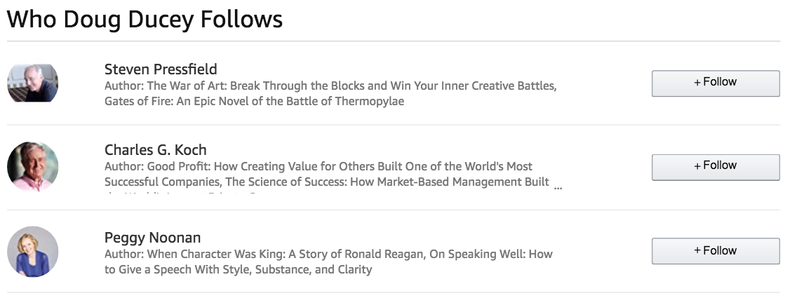 In addition to his wish list, Ducey follows several people on Amazon. The shopping site has a weird feature where you can follow your favorite brands or authors to receive updates on new products.
