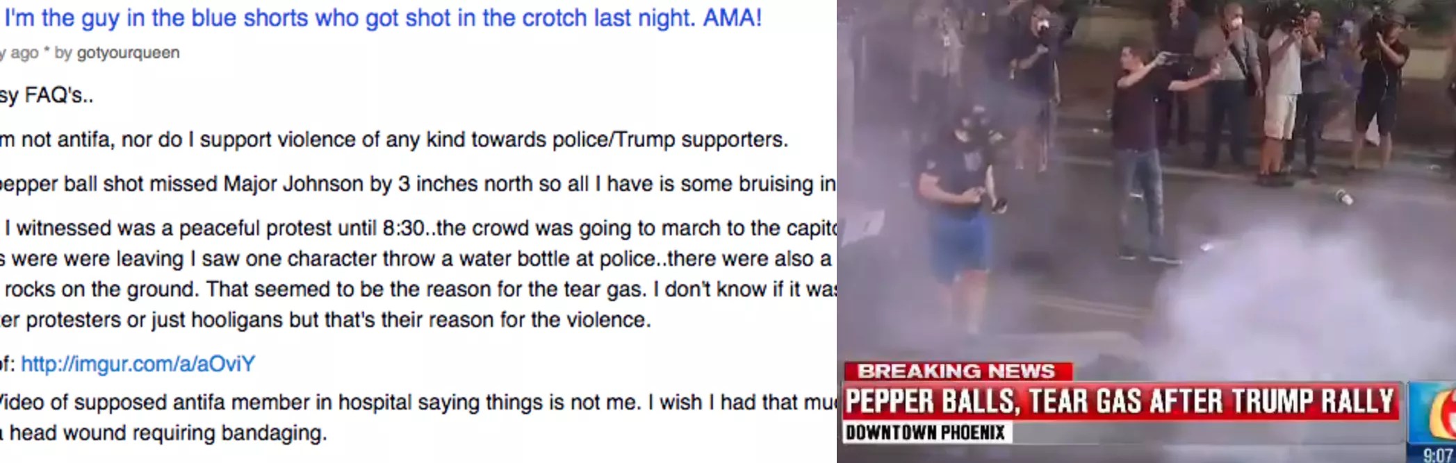 Reddit is a social media platform that allows users to create groups around a theme or topic. The day after the rally, a user named “gotyourqueen” posted in the Phoenix group. The post was titled, “I’m the guy in the blue shorts who got shot in the crotch last night. AMA!” – a Reddit abbreviation for “ask me anything.”