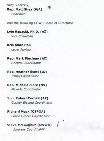 According to the report, COWS was created in April 2014 when Shea and other elected officials from Washington, Idaho, Nevada, and Arizona met in Bunkerville, Nevada, to support the armed militia standoff between federal officials and the Bundy family, who were resisting a federal court order involving grazing fees. The group developed a leadership strategy for “future Patriot Movement armed resistance against the federal government by creating the Coalition of Western States (COWS),” the report states.