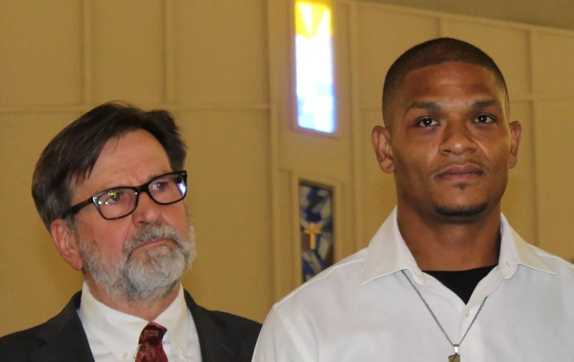 Robert Johnson Jr. (right) and lawyer Joel Robbins at a news conference in June.