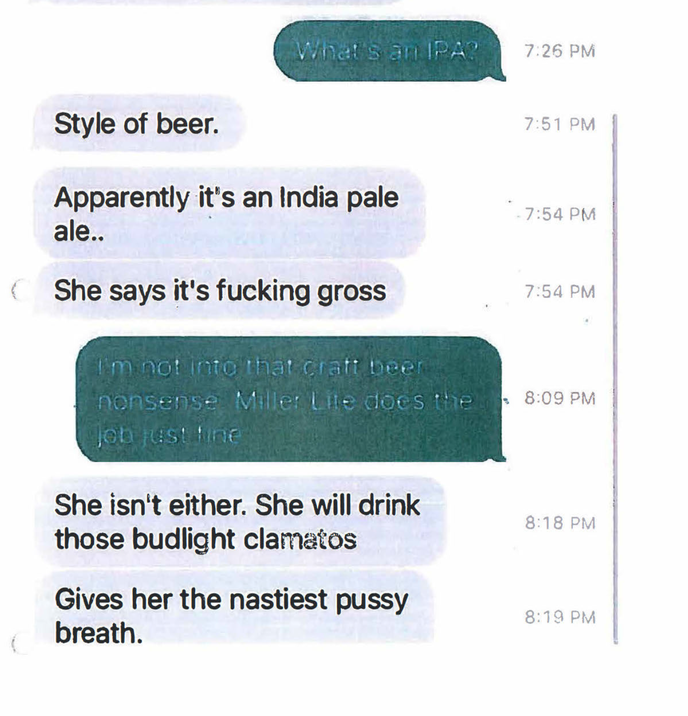 In one message, Phillips asked the witness what kind of beer he drinks before stating that his wife drinks “budlight clamatos” which give her the “nastiest pussy breath.” In a later meeting with a Florence police sergeant, the witness stated that he believed Phillips was impaired that day.