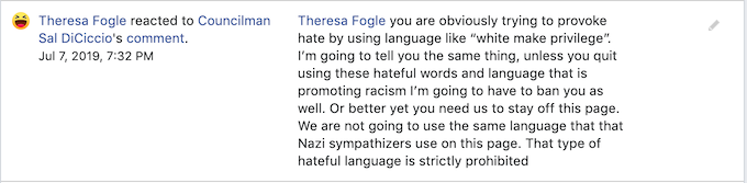 Fogle’s remark apparently struck a nerve with DiCiccio, who said in a now-deleted comment. “Theresa Fogle you are obviously trying to provoke hate by using language like “white make [sic] privilege.” I’m going to tell you the same thing, unless you quit using these hateful words and language that is promoting racism I’m going to have to ban you as well. Or better yet, you need to stay off this page. We are not going to use the same language that Nazi sympathizers use on this page.”