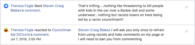 “They’re letting him get away with denying constituents their right to speak,” Fogle said, noting that she had filed a complaint with Facebook after DiCiccio banned her. “This is a government page.”