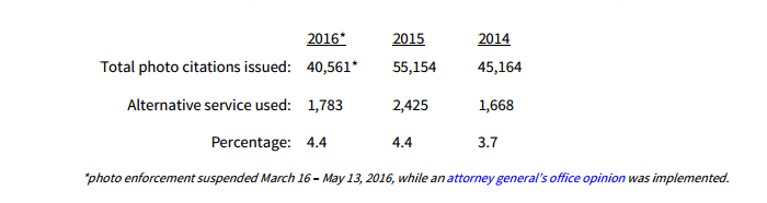 The low percentages for alternative service don’t tell the whole story, because many (if not most) citations don’t require any attention from a process server – that is, the violator waives the right to a process server and pays the fine immediately. Only about 65 percent of notices of violation get turned into citations, according to a 2015 city audit of the photo-enforcement program. For 2015, that means about 30,000 notices of violation never turned into citations, despite the use of alternative service in 2,425 cases.