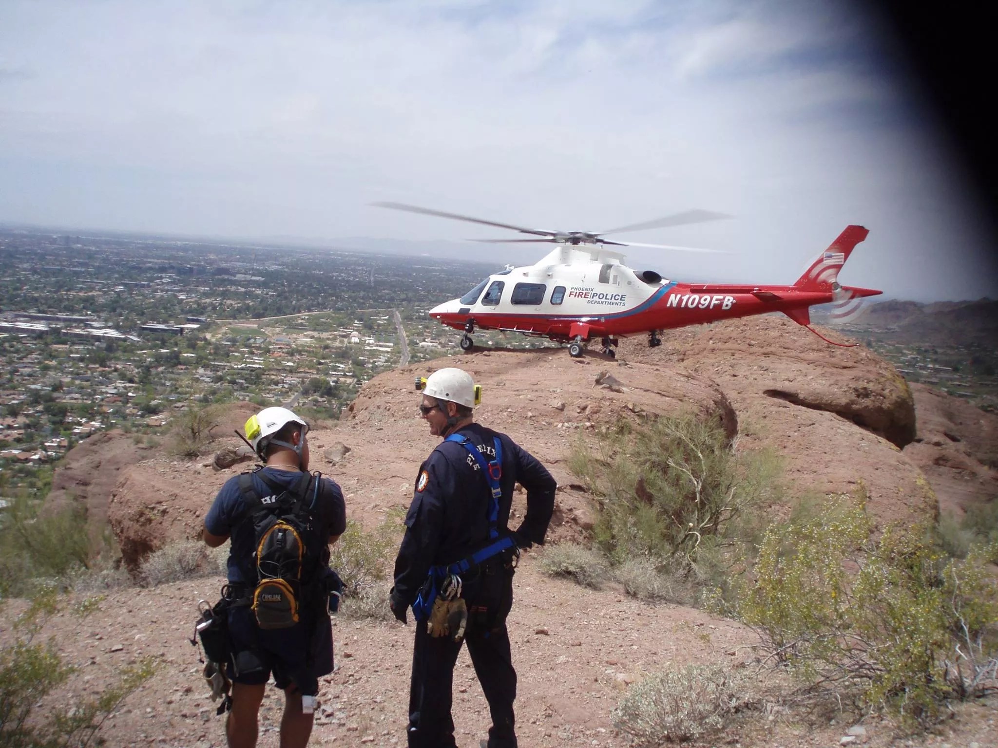 Several hikers watched in horror as the man fell, and heard his screams. He landed in the thicket of mesquite and bushes at the base of the cliff. Firefighters used the “long-line” rescue method, flying him out in a stretcher at the end of a very long rope.