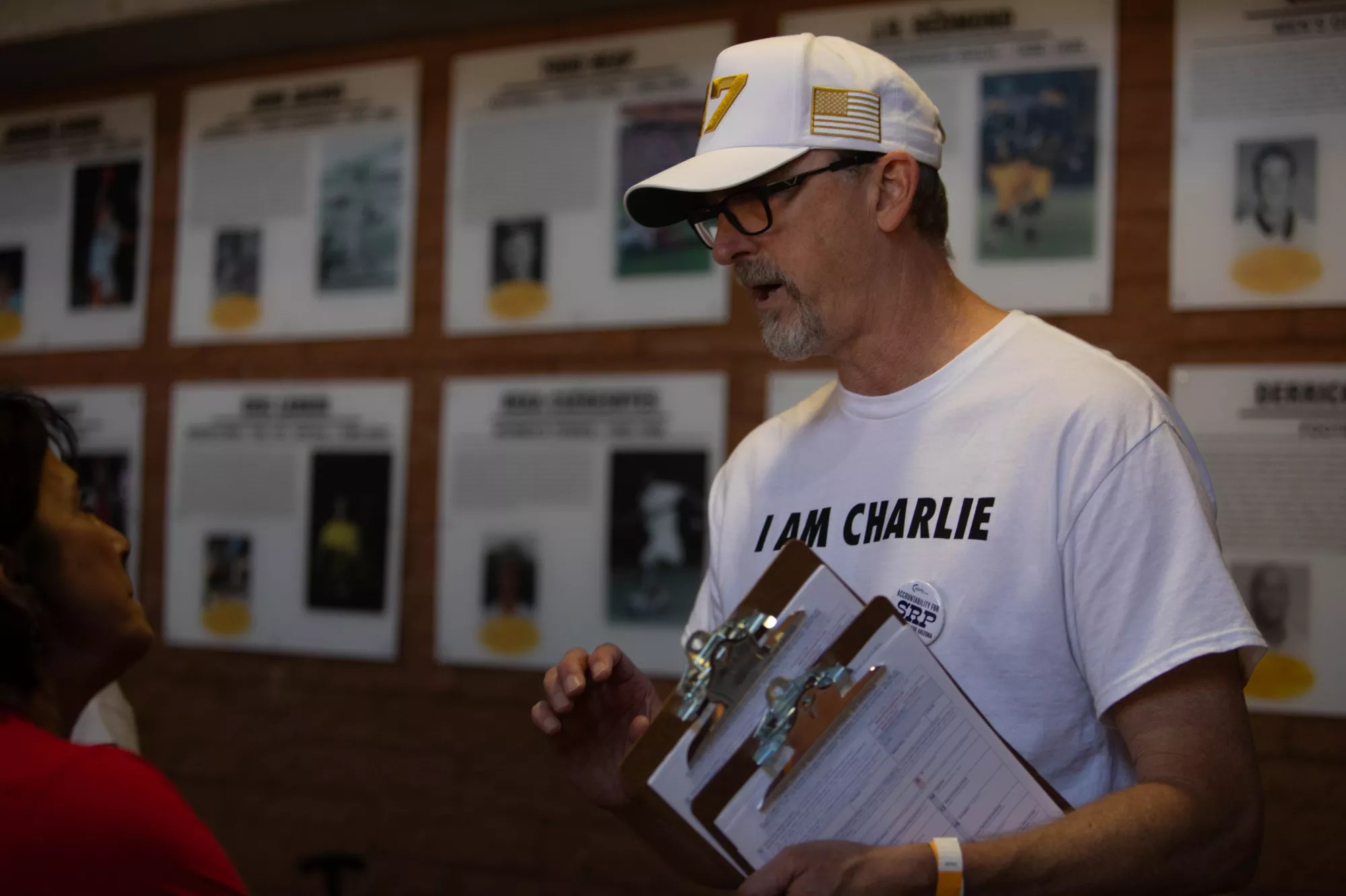 Tyler Bowyer, Turning Point’s chief operating officer and one of the Arizonans indicted for their role in attempting to overturn the 2020 election, encouraged attendees to vote. At the door, attendees were met with TPUSA staff and volunteers wearing white “I am Charlie” t-shirts, asking if people were registered to vote – particularly for the upcoming Salt River Project election, which the organization has gotten involved in.