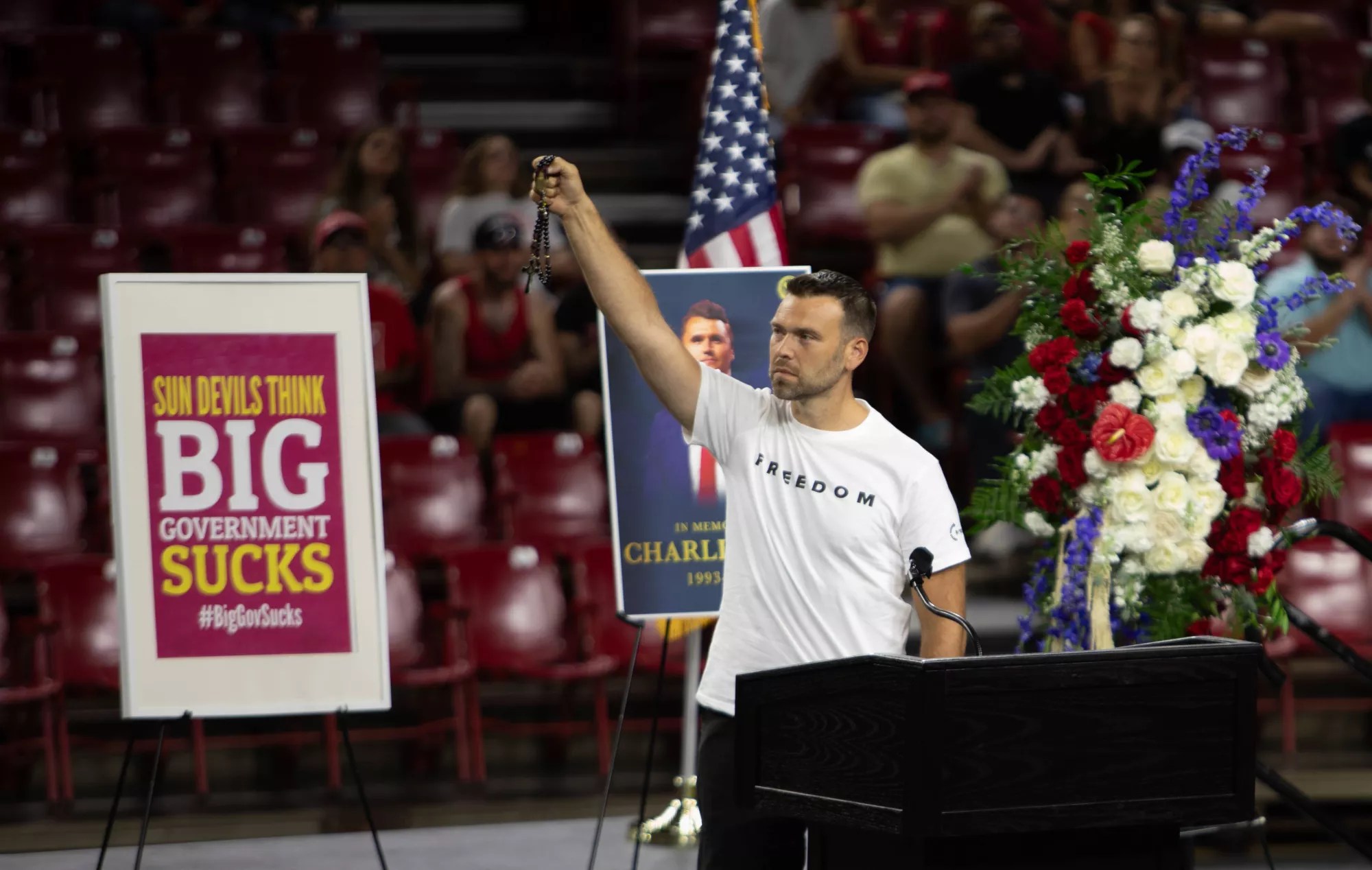 A Catholic priest read from the Bible and an ASU professor called Kirk “the American Socrates” – a generous appraisal of Kirk’s in-your-face debating style. Turning Point contributor Anthony Watson called Kirk a “saint,” while Lucas Miles, the senior director of TPUSA Faith, said Kirk “died a martyr for Jesus Christ.”