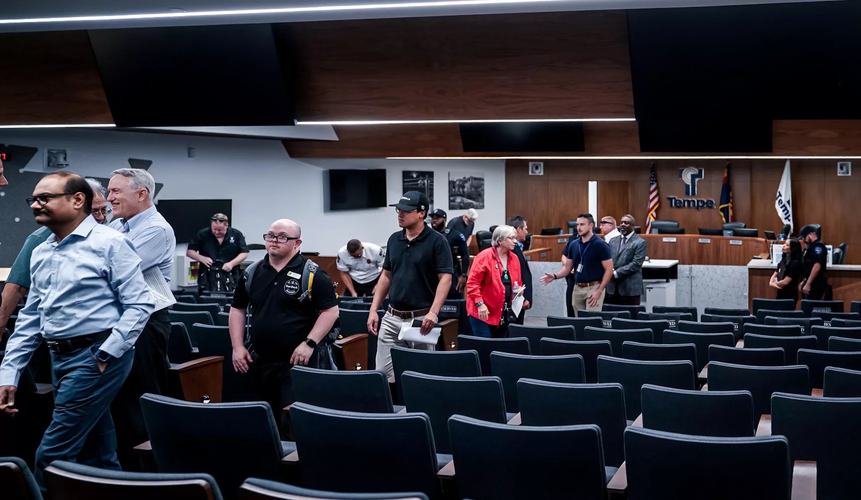 Attendees evacuate the Tempe Municipal Building.