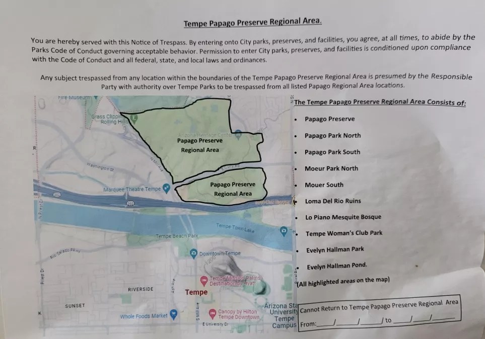 On July 1, a park ranger cited Davis for trespassing at Moeur Park, minutes after the park had closed. Davis said he was there to help clean up trash at the request of a group of unhoused people whom rangers were kicking out of the park. As a result, Davis was banned from all Tempe parks in the Papago Park Preserve through Aug. 2.
