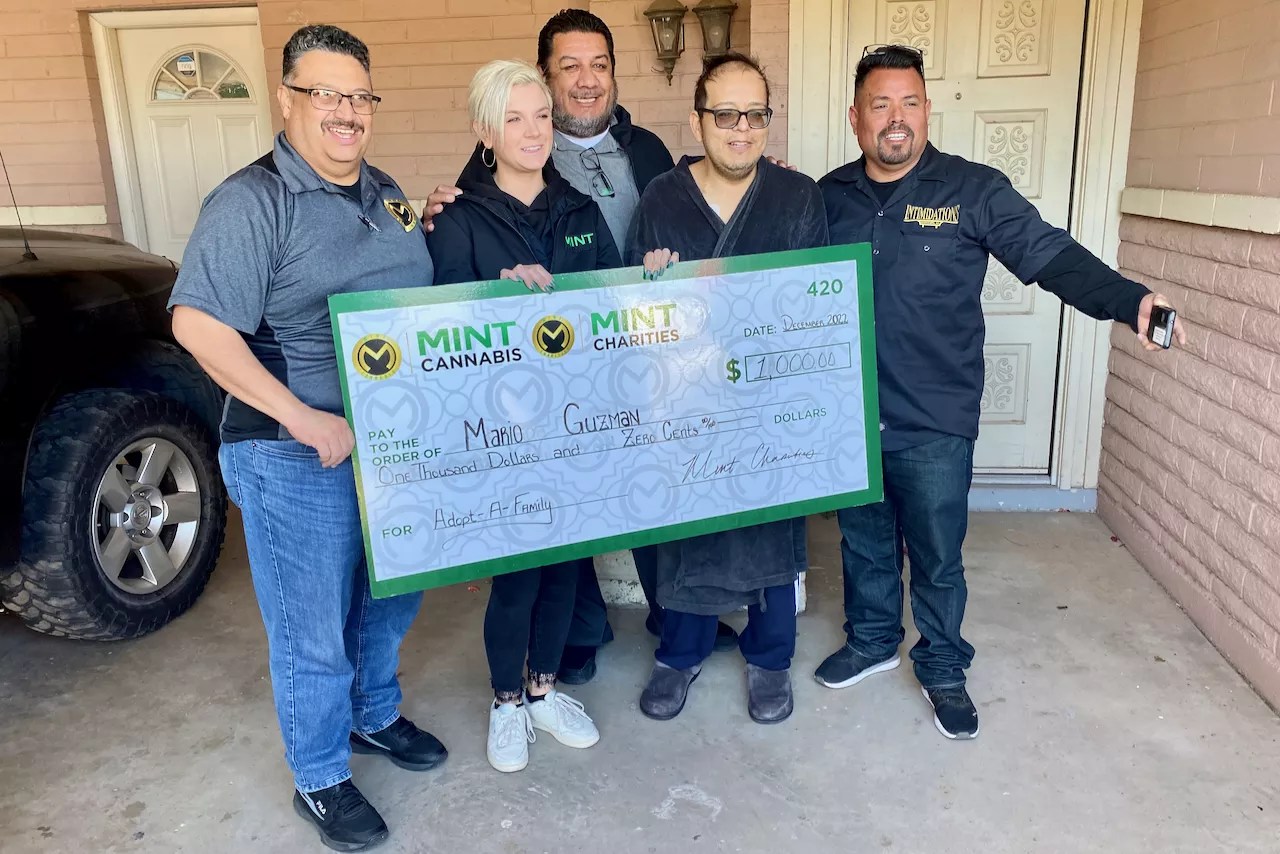 Step aside, Kombucha. Cannabis-infused beverages are bubbling over and it’s got to be one of tastiest innovations in Arizona’s young recreational cannabis scene. Wellness cannabrands boast of low-sugar content and antimicrobial properties as they expand their market share while pot-infused, alcohol-free wine and margaritas are making their mark, too. The surge in cannabis-infused beverage sales is fueled by growing consumer demand for wellness drinks, alternative ways to consume cannabis, and an influx of investment from beverage manufacturers looking to capitalize on the greater accessibility of cannabis. “It’s something more and more people are coming in asking for,” Sarah Mahoney, store manager at The Hemp and CBD Co. in Gilbert, told us in March. (Left to right) Pablo Palomino, Lexie Coleman, and Raul Molina from Mint Cannabis; Mario Alberto Núñez Guzmán; and Miguel Alvarado, who nominated Guzmán for the Adopt-A-Family gift. Geri Koeppel