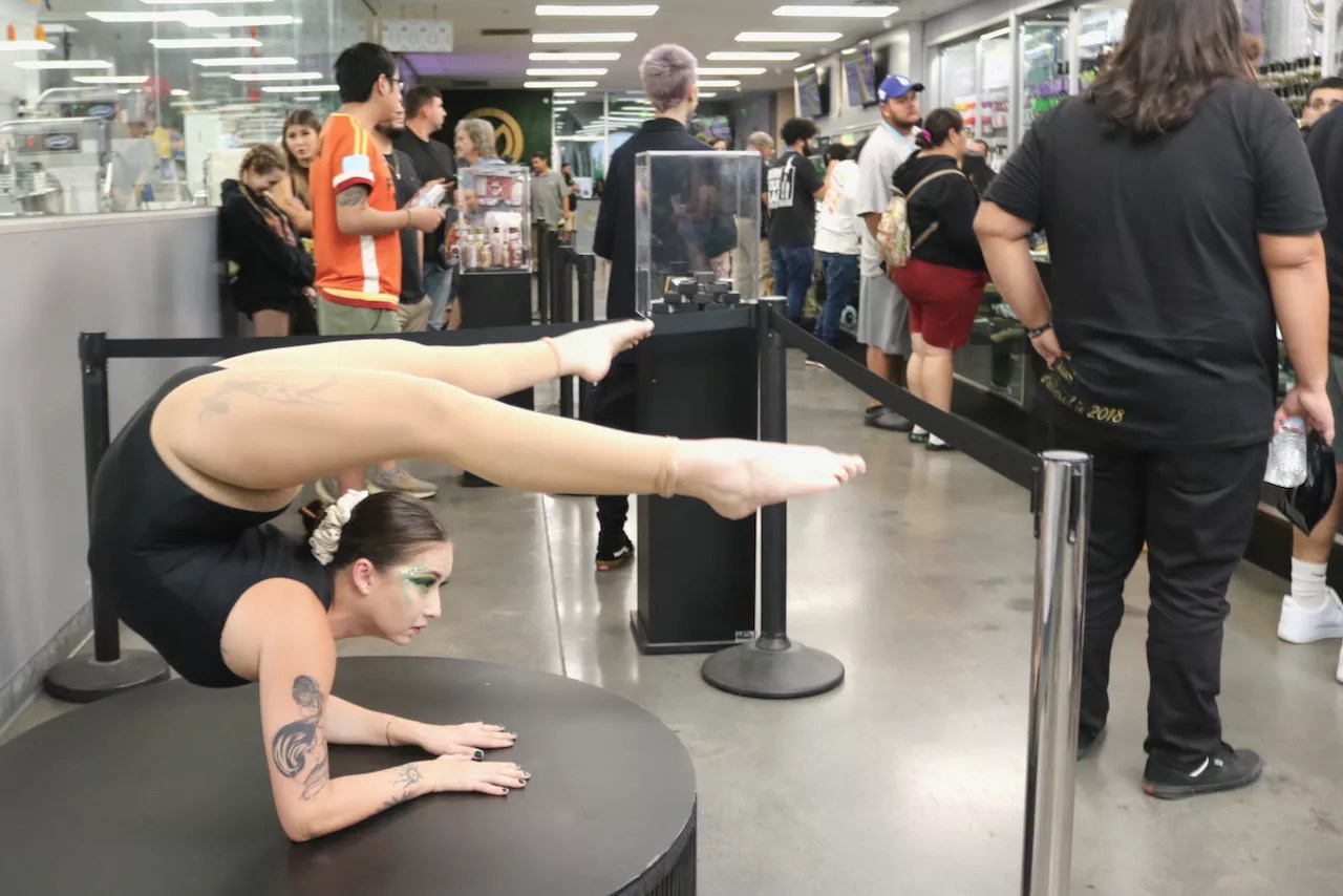 The first 100 people, ages 21 and older, received a goody bag. Between midnight at 8 a.m., all visitors ages 21 and older received a free pre-roll. In the foyer, Mint staff checked customers’ IDs before they were allowed to enter the showroom. And folks waiting in line inside the showroom were greeted by Alexis Bohl, a contortionist who was backbending and posing upside-down on a small stage.