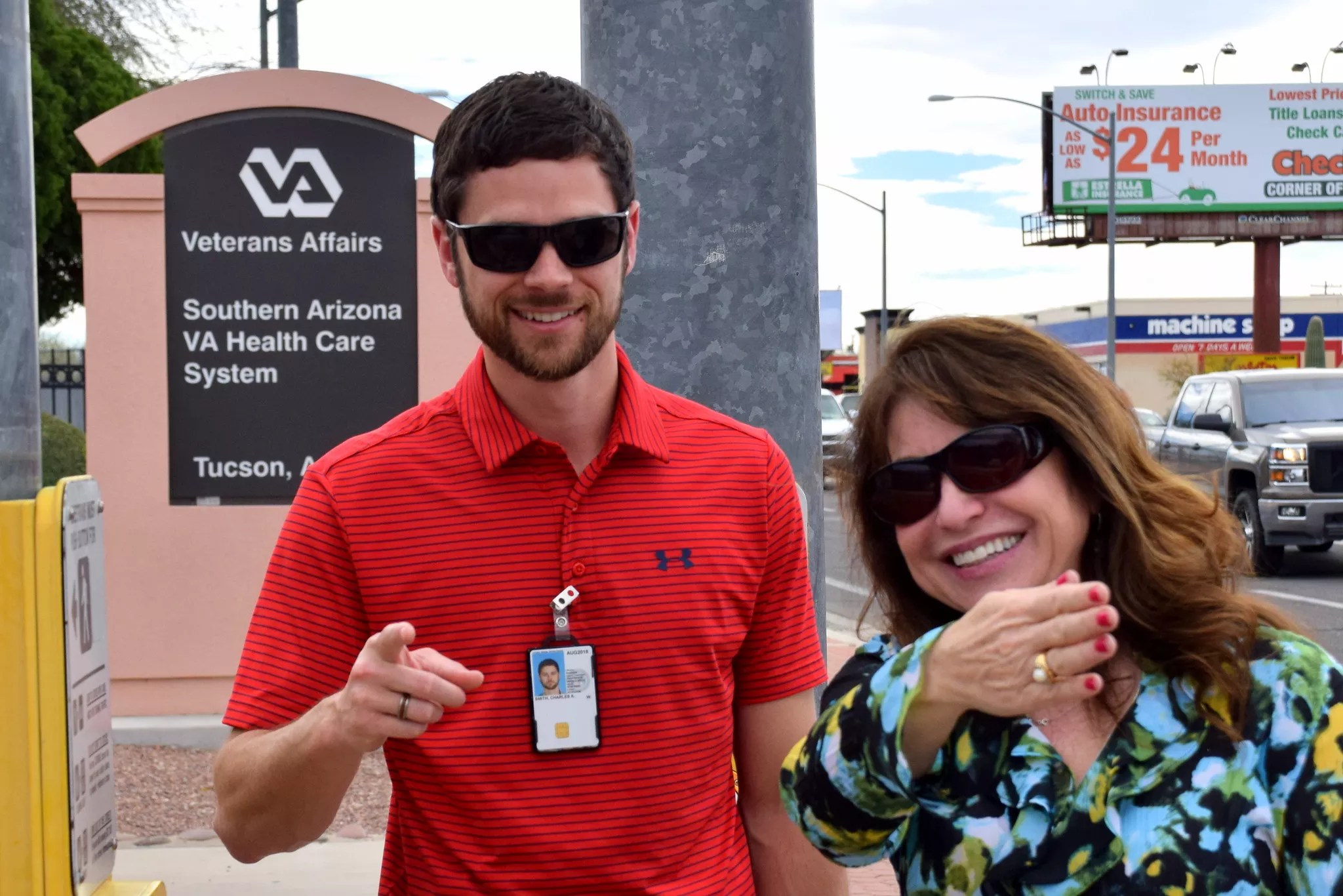 Paula Pedene (right) gestures outside a Tucson VA facility with orientation and mobility instructor Charles Alex Smith.