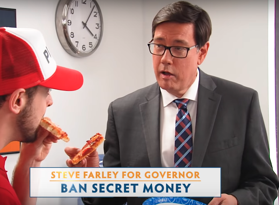 State Senator Steve Farley delivers policy briefs over pizza, according to this campaign ad.