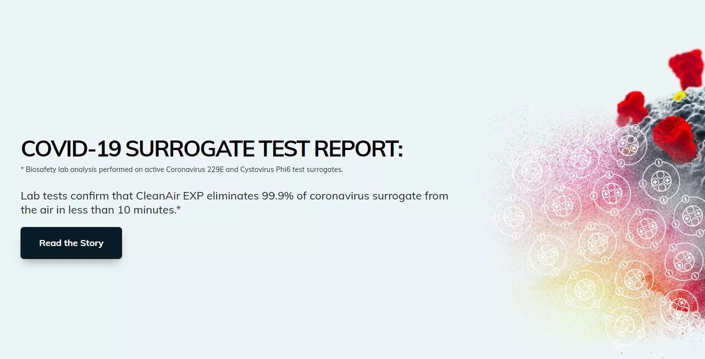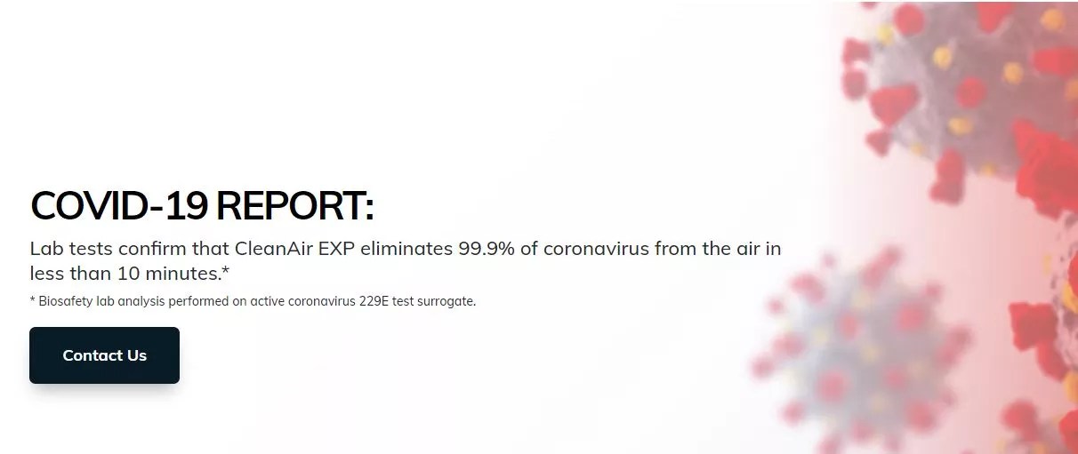 The company’s website has a blurb about COVID stating: “COVID-19 REPORT: Lab tests confirm that CleanAir EXP eliminates 99.9% of coronavirus from the air in less than 10 minutes.*”