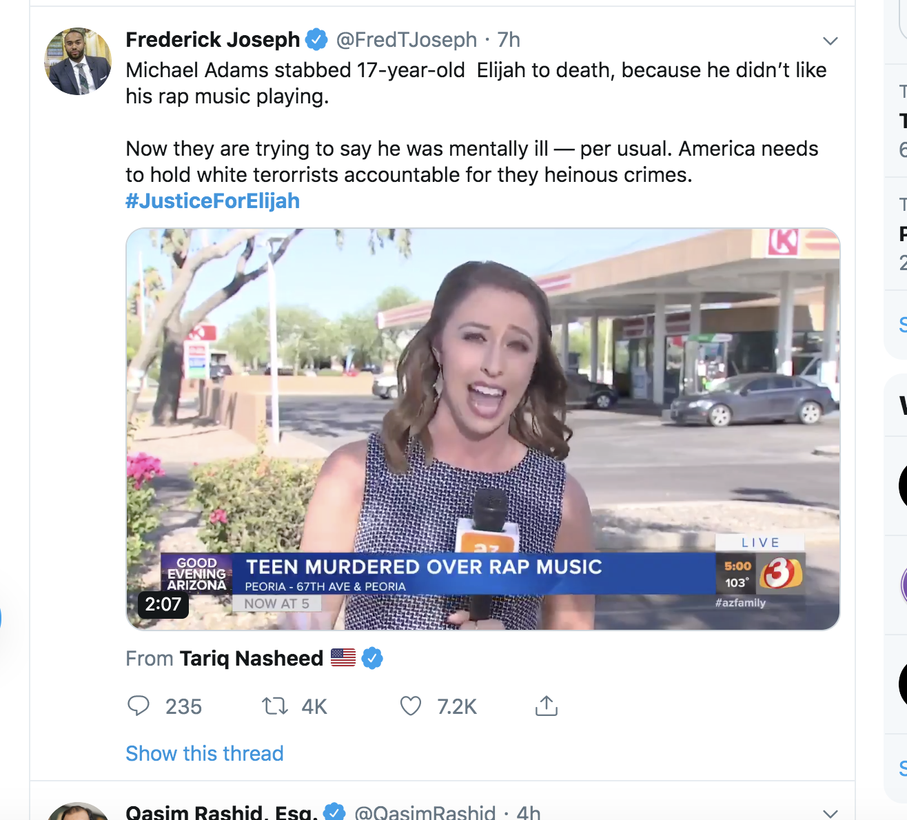 Activists on Twitter are calling for law enforcement and the media to recognize the murder of 17-year-old Elijah Al-Amin, whose throat was slit outside a Peoria Circle K on the Fourth of July, as an act of racism. Twitter