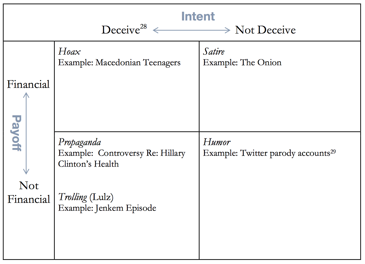 Researchers at the University of Arizona James E. Rogers College of Law categorized fake news and its incentives.