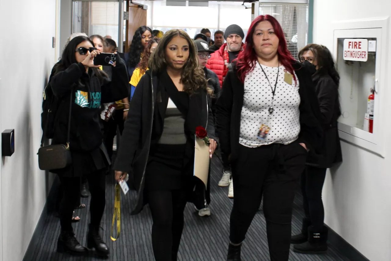 State Rep. Analise Ortiz (center) and Sen. Anna Hernandez (right) and members of Family Justice Collective walk through the state House on Thursday.