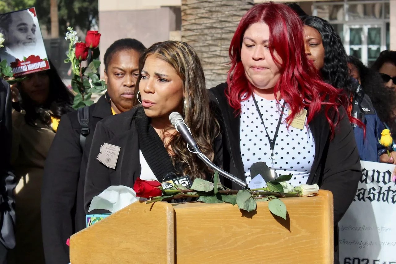 Other family members with relatives killed by police, including Roland Harris – the father of Jacob Harris, whom Phoenix police killed in 2019 – surrounded the speakers, holding roses and framed pictures of the loved ones they lost. Others displayed a poster with the hundreds of names of people killed by Phoenix officers since 2014.