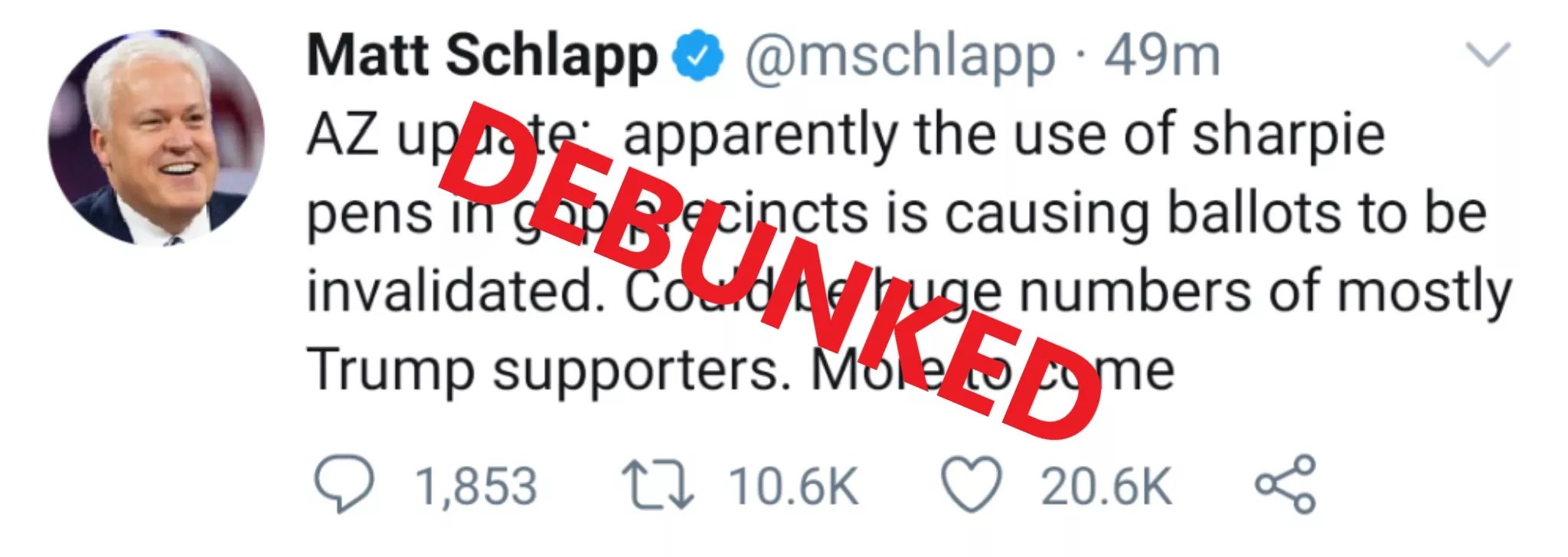 The national Students for Trump account tweeted out a video, from an unknown source, of people who said they had been told to stop handing out ballpoint pens at polling locations. Fox News contributor Matt Schlapp has repeatedly made the same claim. Each has received thousands of retweets.