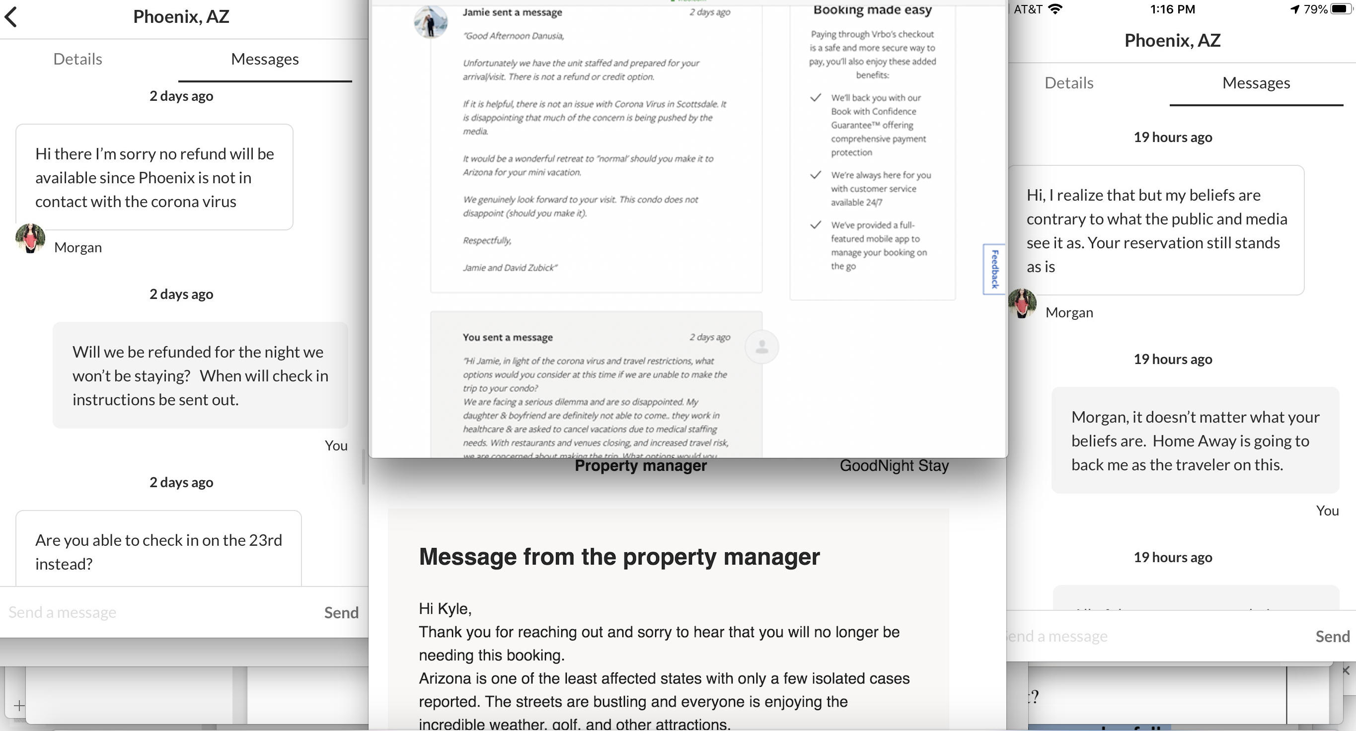 After New Times published its story, the company proceeded to deny making those claims, alleging that the information had been “manipulated by a disgruntled guest,” according to emails shared with New Times by Wayne Schutsky, managing editor of the Scottsdale Progress. In the emails, GoodNight Stay also shared a screenshot with a falsified booking date, alleging they’d actually messaged the customer that information on March 6, before the novel coronavirus situation worsened. A Vrbo representative confirmed this is not true – GoodNight Stay sent the messages on March 16, as the customer had stated.