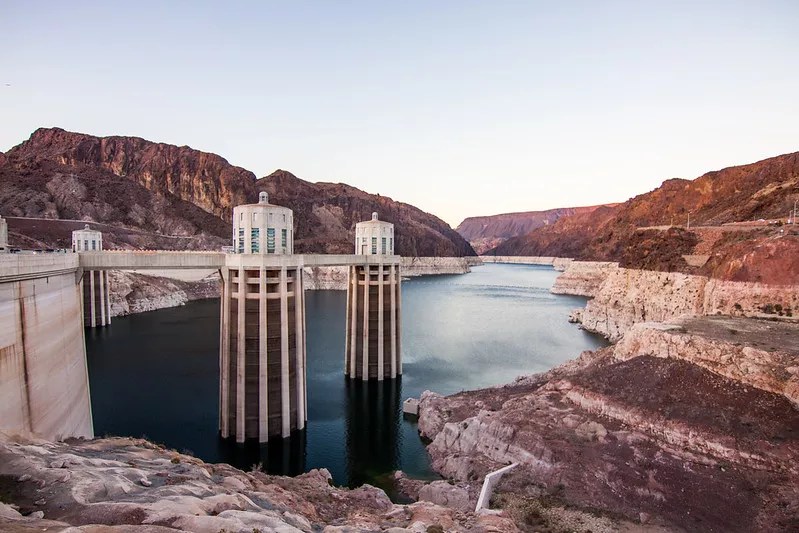 Lake Mead, the Hoover Dam, and the famous “bathtub ring” showing dropping water levels, in March 2019