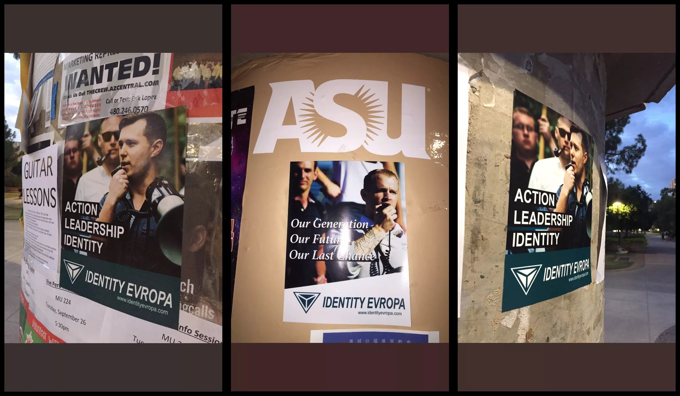 Posters and stickers promoting an alleged white supremacist group were found on Arizona State University’s campus Tuesday. Online, the hate group, known as Identity Evropa, shared images of the posters on display at the Tempe campus as a part of a campaign to advertise on college campuses.