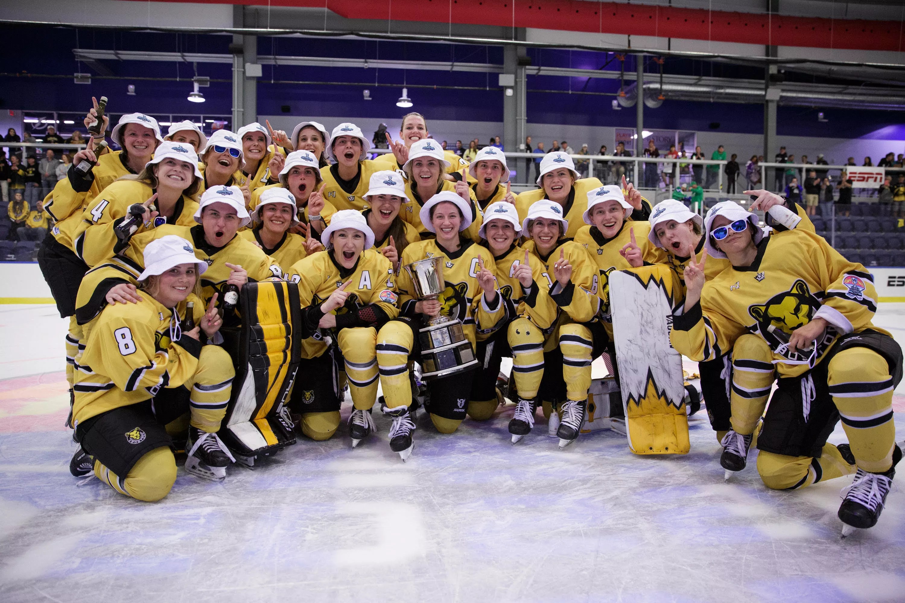 The Boston Pride celebrate their 2022 Isobel Cup Championship following a 4-2 victory over the Connecticut Whale at AdventHealth Center Ice in Wesley Chapel, Florida.