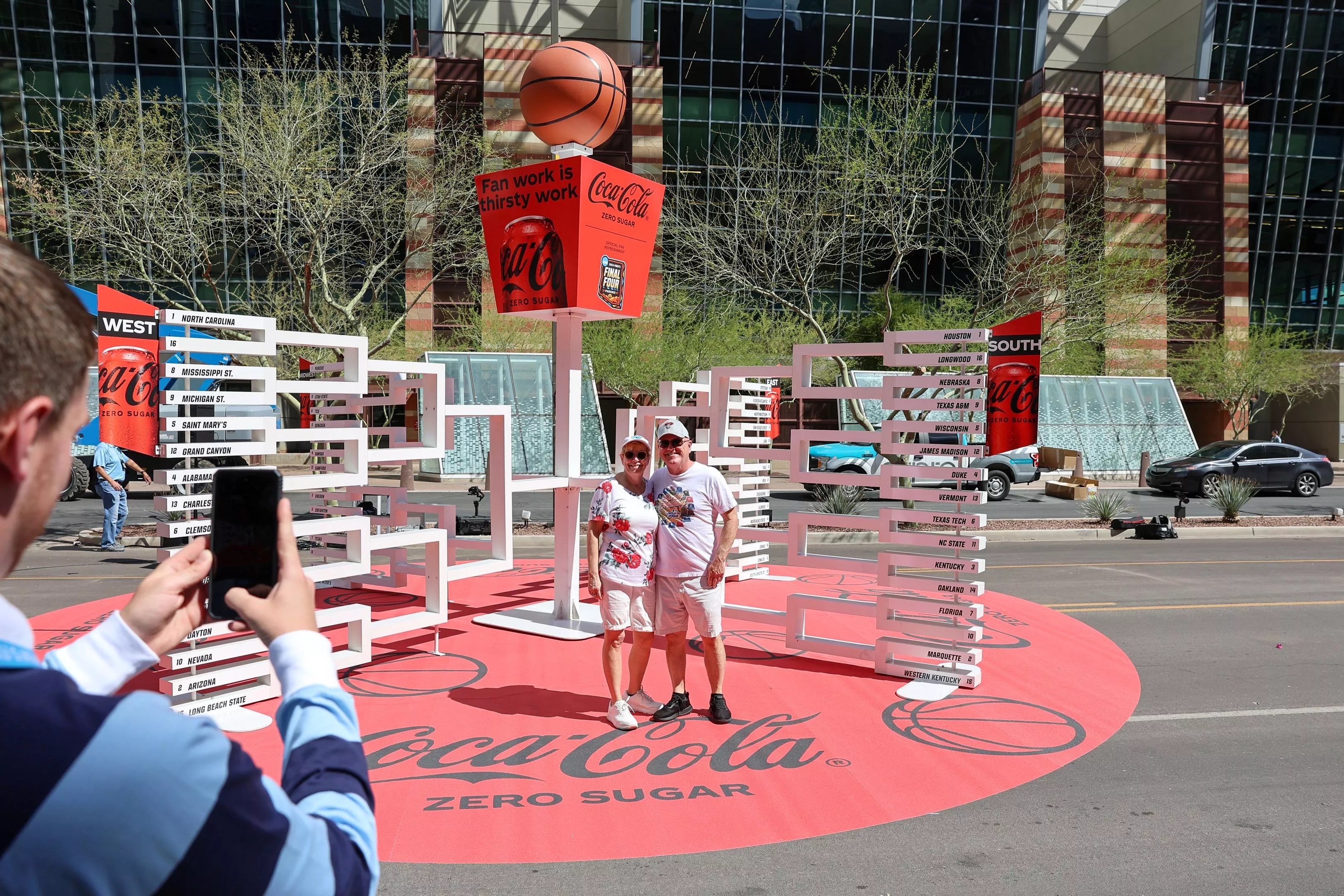 On Friday at State Farm Stadium, you can catch open team practices of the four contenders for free at the Reese’s Men’s Final Four Friday. The event will also feature interactive activities and entertainment for fans of all ages, according to the organizing committee. Top senior student-athletes from around the country will also be playing in the Reese’s NABC All-Star Game on the court. A 3D bracket for the NCAA Men’s Basketball Tournament was unveiled in downtown Phoenix on March 19. Phoenix Local Organizing Committee
