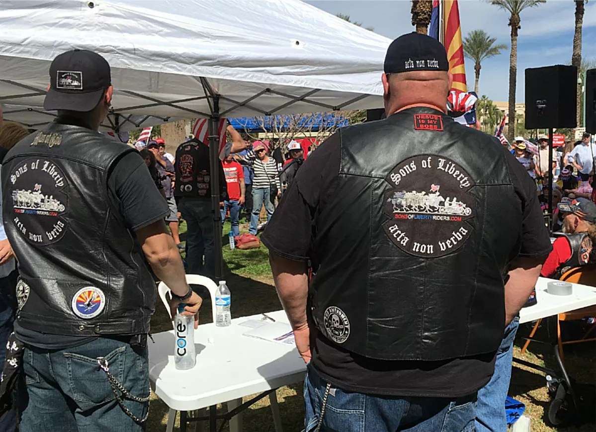 The black clad biker group Sons of Liberty Riders was working with the militiamen on security for the event, according to organizer Barb Heller.