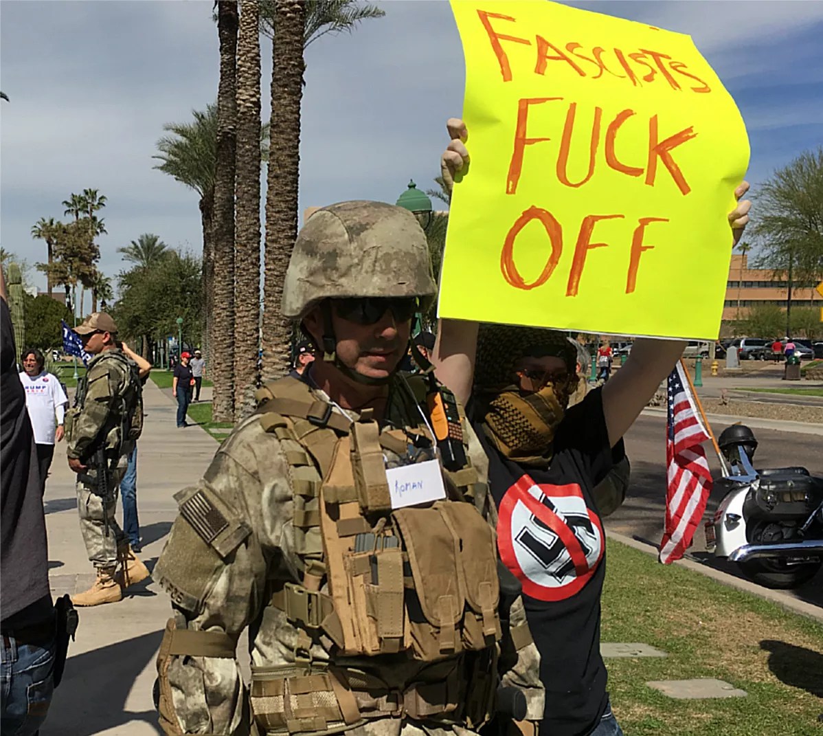 The lone antifascist chick on the sidewalk holding a yellow sign that read “Fascists Fuck Off” at Saturday’s March4Trump rally at the Arizona state Capitol deserves a medal of some sort.