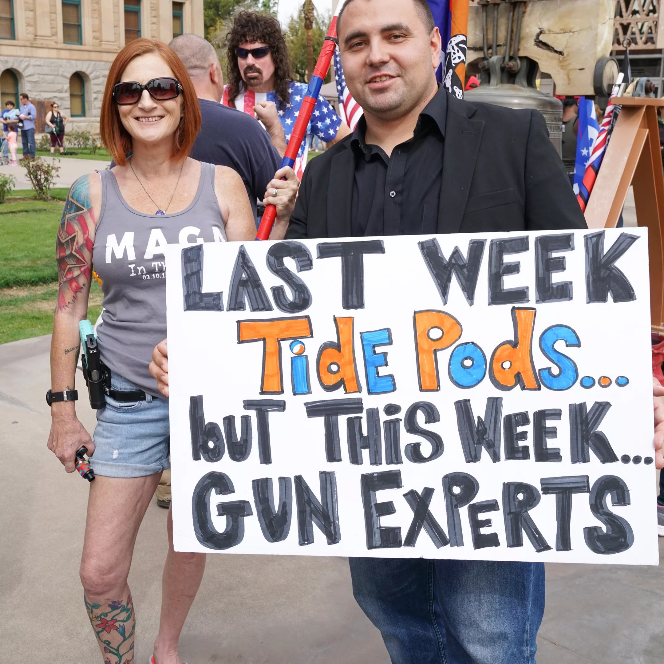 One couple came to the the Phoenix rally packing sidearms and carrying a sign that said: “Last Week Tide Pods … but This Week Gun Experts.”