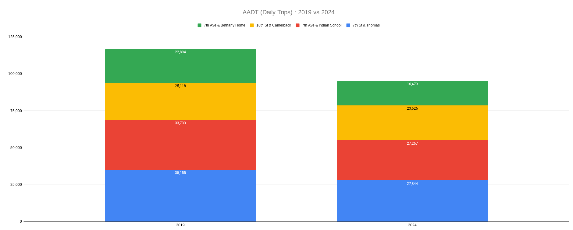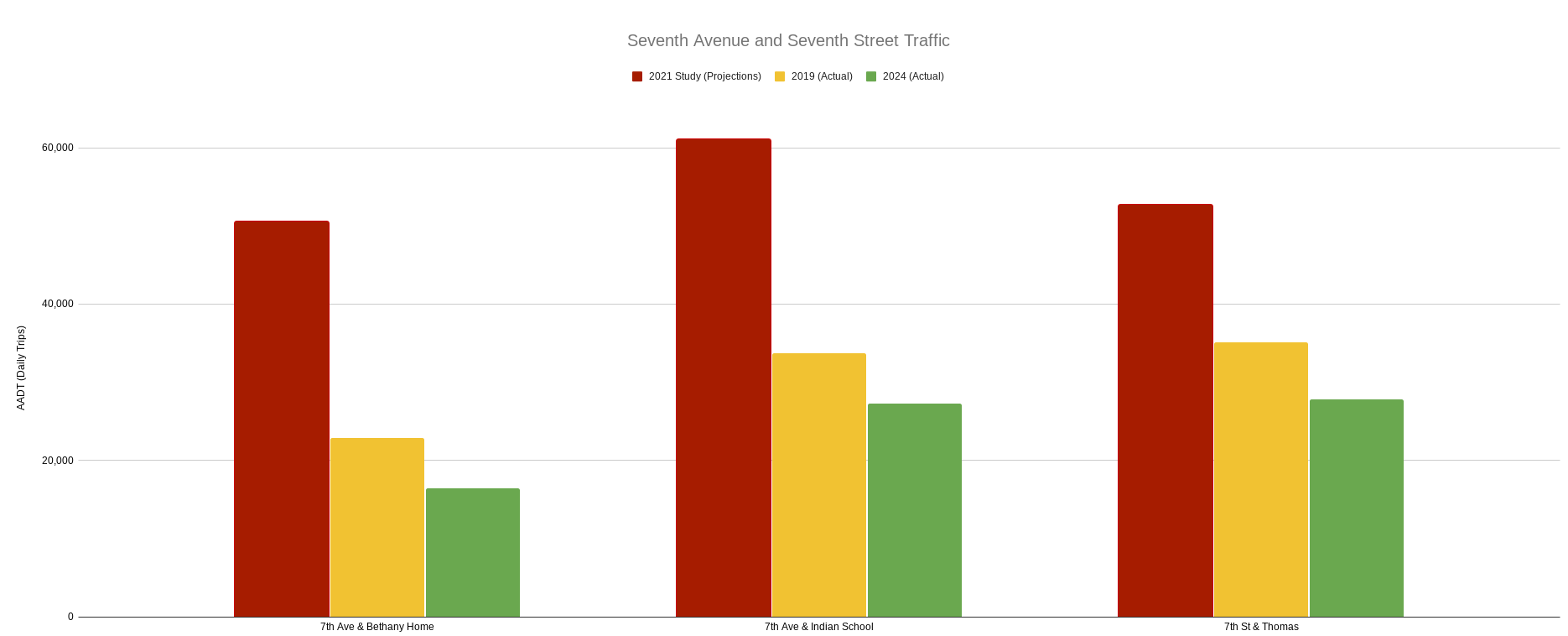 The actual data tells a starkly different story: MAG traffic counts from five identical segments on Seventh Street and Seventh Avenue show that AADT has decreased by more than 20% between 2019 and 2024. There is no traffic surge. The congestion argument, and the subsequent fear of traffic “rippling out to parallel streets,” is based on these debunked projections.