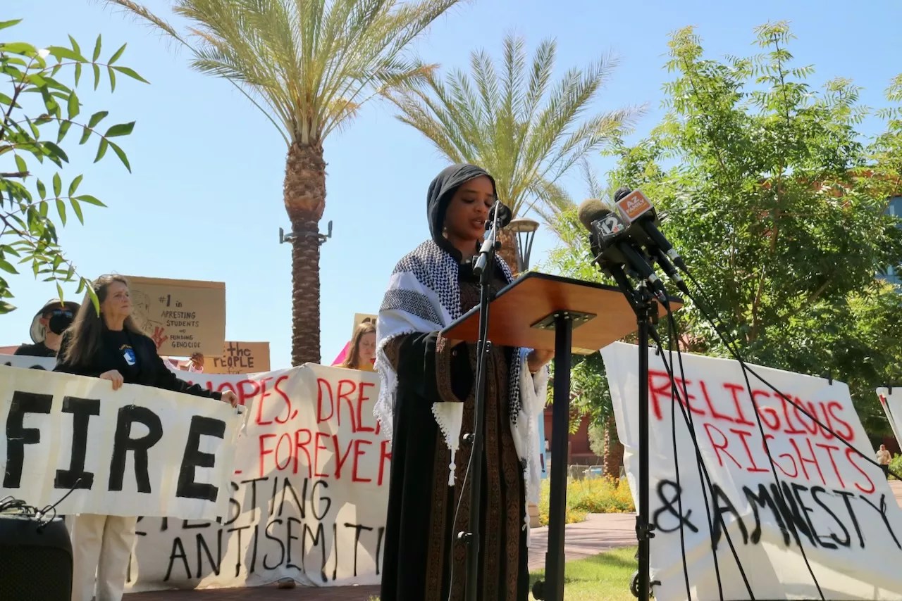 Tarteel Alimam, an alumnus of Arizona State University, told reporters and supporters on Thursday that the punishment doled out by ASU for to pro-Palestinian protesters was a “disproportionate response.”