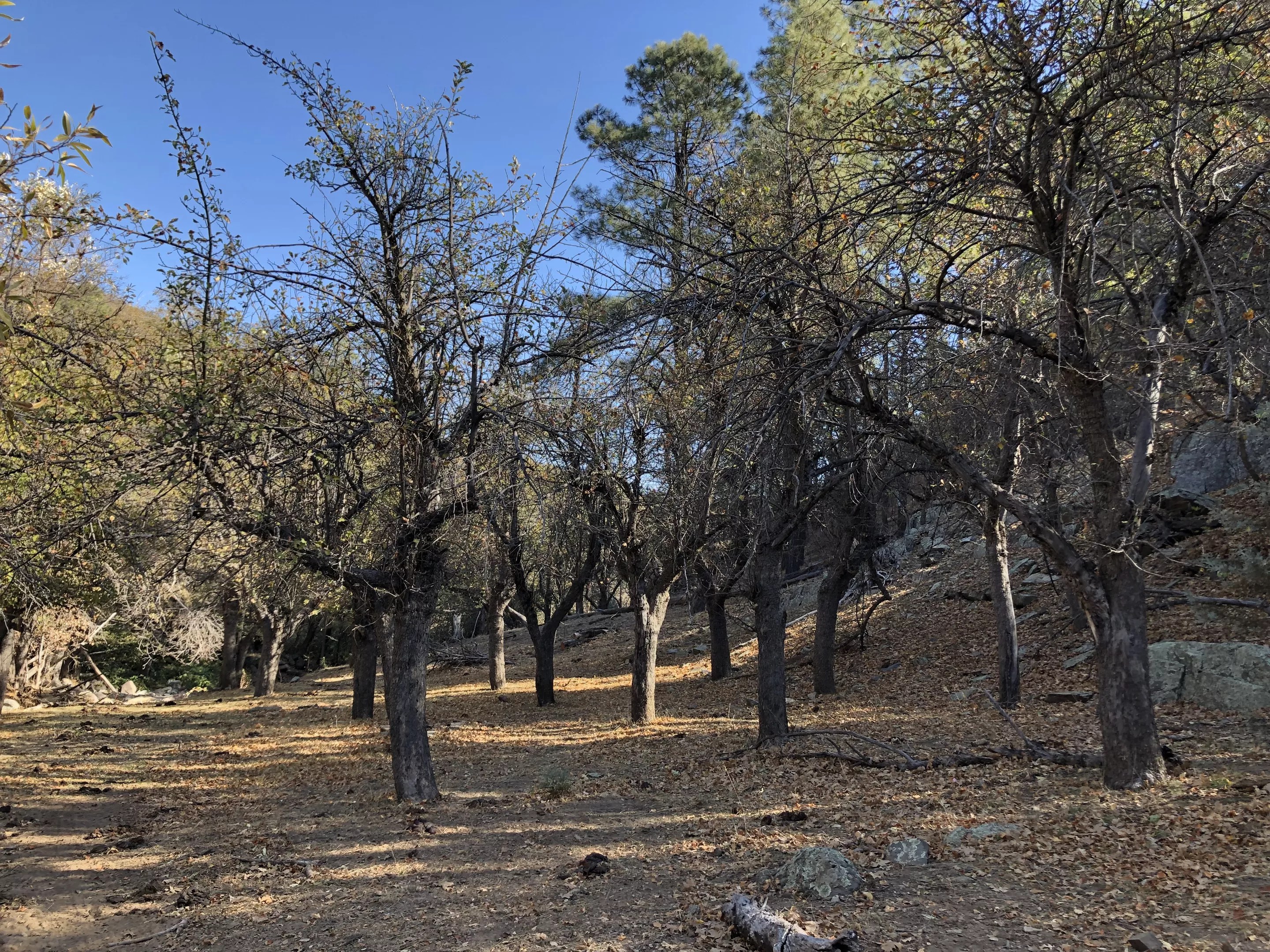 And then, five minutes downhill, like a bolt of lightning illuminating a dark landscape, you realize the orchard has risen around you. Short trees under tall pines. Leaves mostly fallen. A low, broken stone pillar once part of a home. And here, the past of gold rushes and settlers lives on in faint echo – a forgotten orchard in the Bradshaws, half reclaimed by lofty pines, looking like the white ruins of a Greek temple.