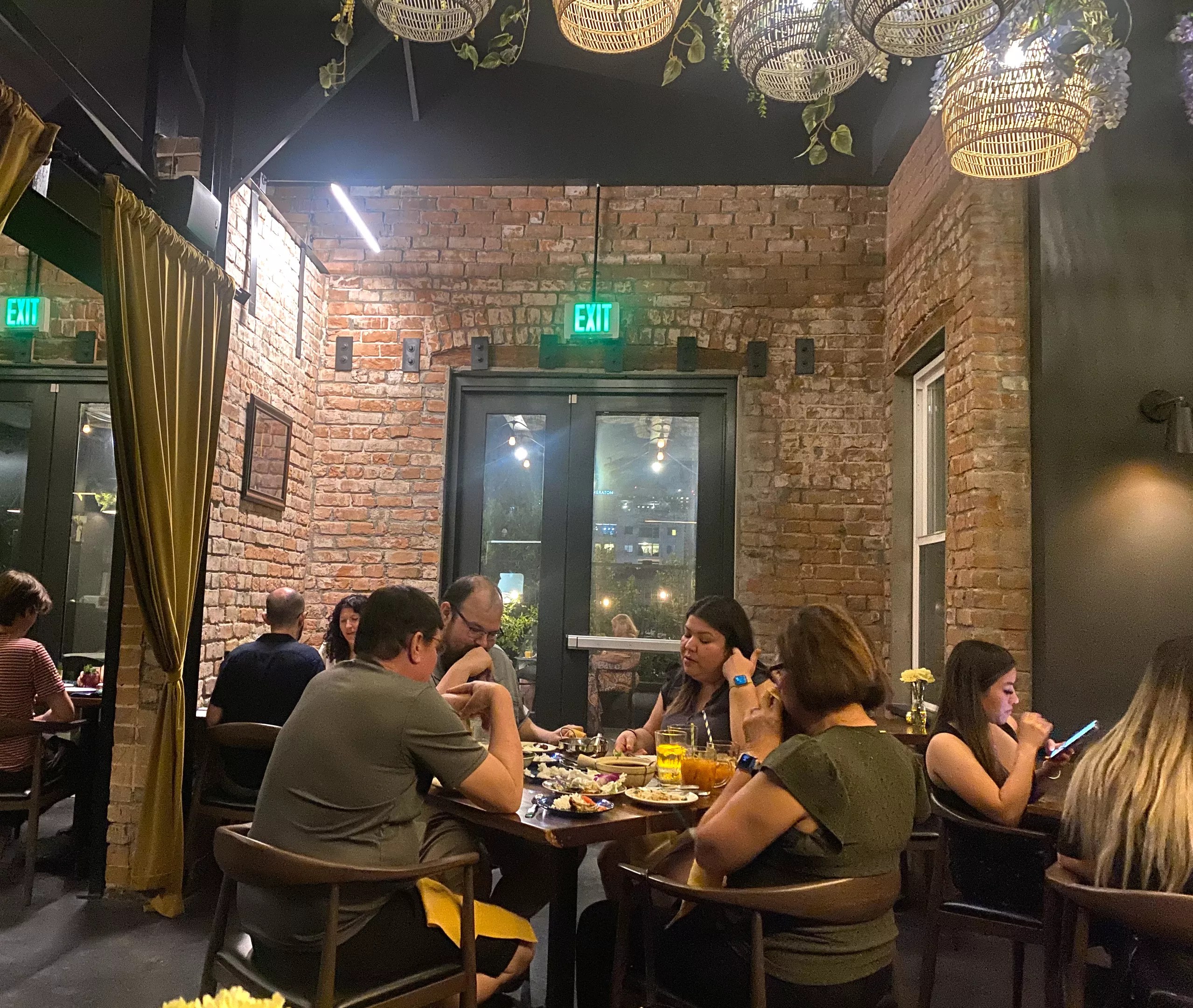 Exposed brick walls, wooden tables, and rattan chandeliers decorate the interior.
