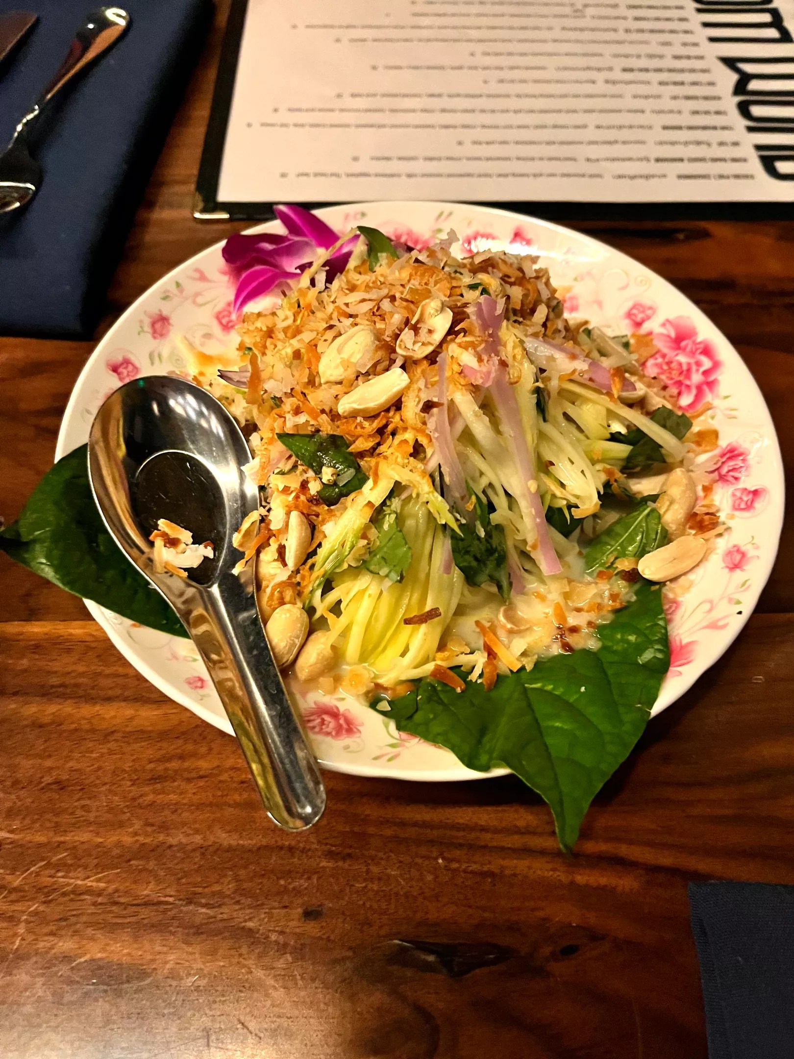 A different take on protein, the Kaeng Hang Lay pork belly curry, came next. This dish is from Northern Thailand and the recipe lacks the often expected coconut milk that many Thai curries are known for. Tender pork belly adorned the aromatic stew, topped with ginger matchsticks, toasted peanuts, and a hint of tamarind. It’s best poured generously over the accompanying jasmine rice.