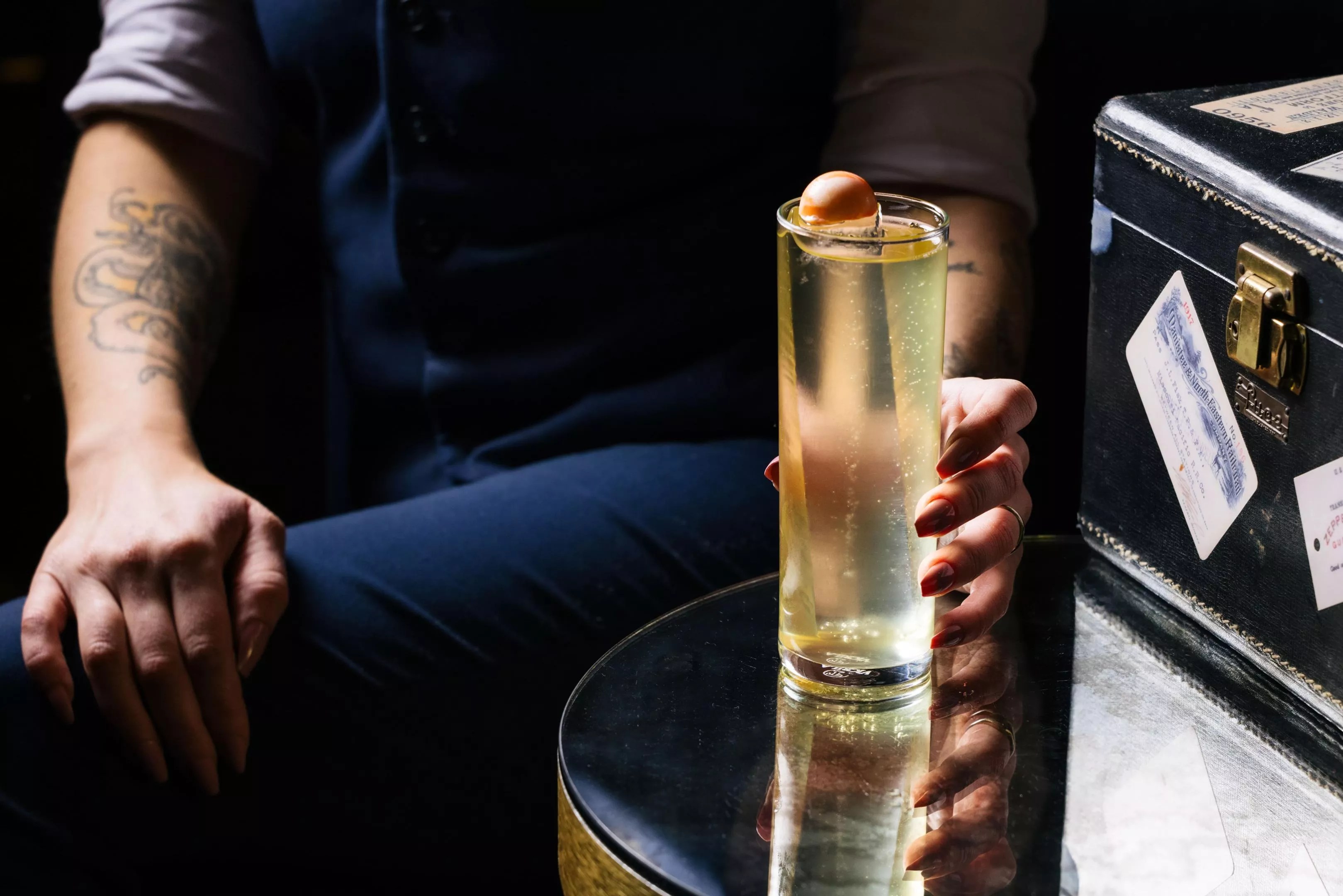 The drink A Fight a Night nods to Owney Madden, a gangster and owner of infamous speakeasies including the Cotton Club. The cocktail is inspired by the aromatics used in the Irish dish shepherd’s pie – bay leaf, thyme, carrot and celery. The whiskey and bourbon-based cocktail is clarified with a technique borrowed from winemakers that uses potatoes, Asher says. The drink is paired with a side of house potato chips dusted with a chive and white cheddar powder.